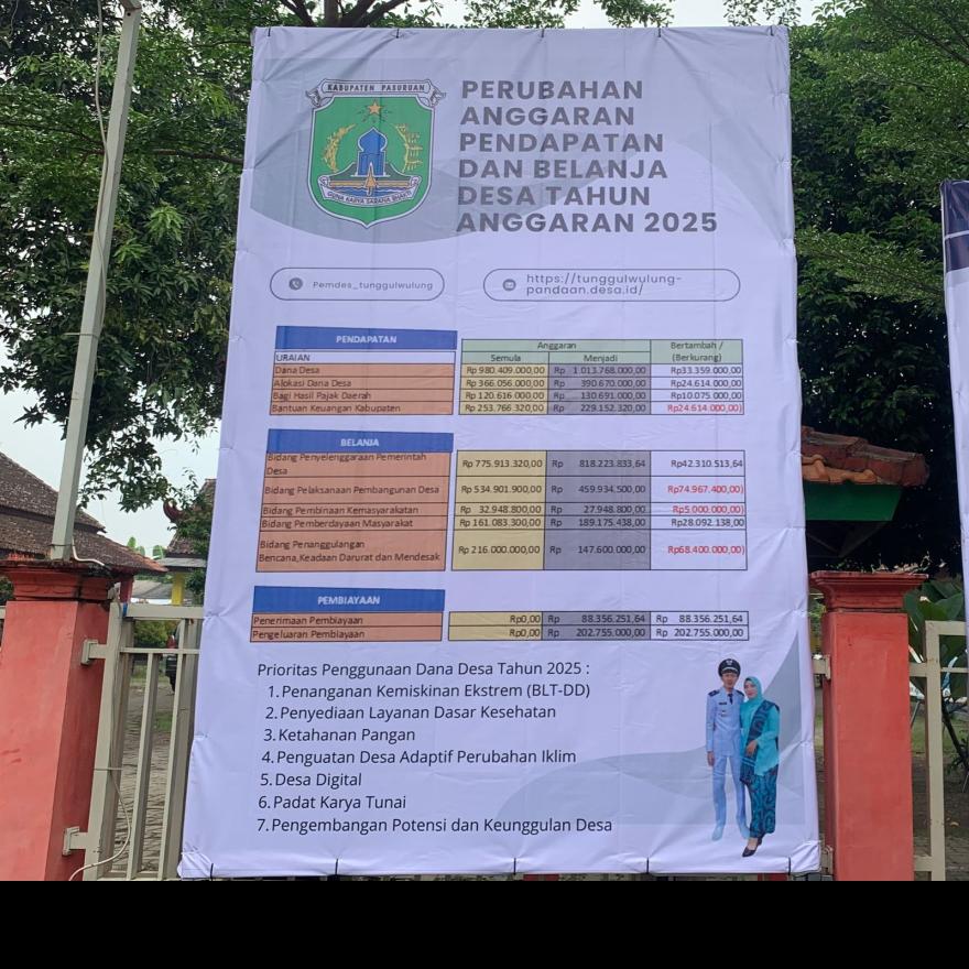 Dalam upaya meningkatkan transparansi tata kelola keuangan desa, Pemerintah Desa Tunggulwulung telah memasang papan informasi publik yang memuat Laporan Realisasi APBDes Tahun Anggaran 2024, serta Anggaran Pendapatan dan Belanja Desa (APBDes) 2025 dan Perubahan APBDes (P-APBDes) 2025.